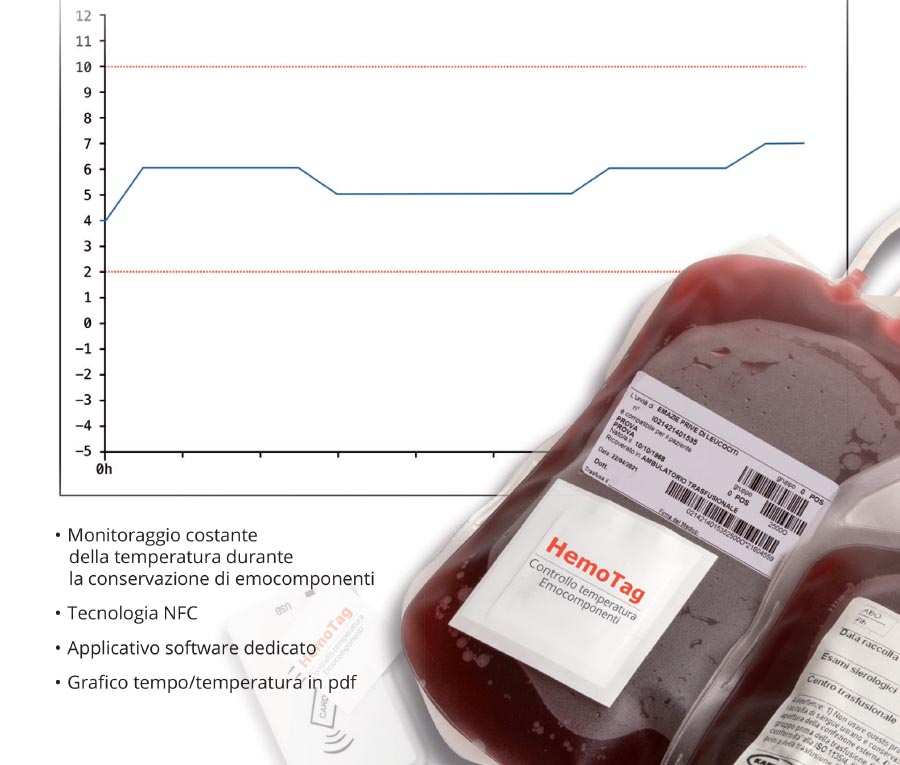 Il sistema HemoTag (Dispositivo Medico) permette il monitoraggio costante della temperatura durante la conservazione delle sacche di sangue. Il tag NFC, una volta attivato, registra i dati della temperatura sulla base dei parametri impostati dal Centro Trasfusionale.