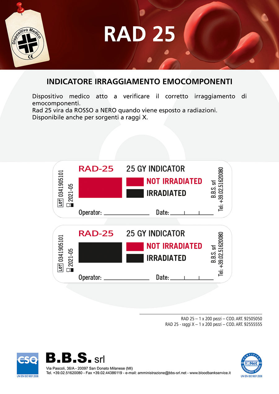 RAD 25 è un Dispositivo Medico utilizzato per verificare l’avvenuto irraggiamento degli emocomponenti.